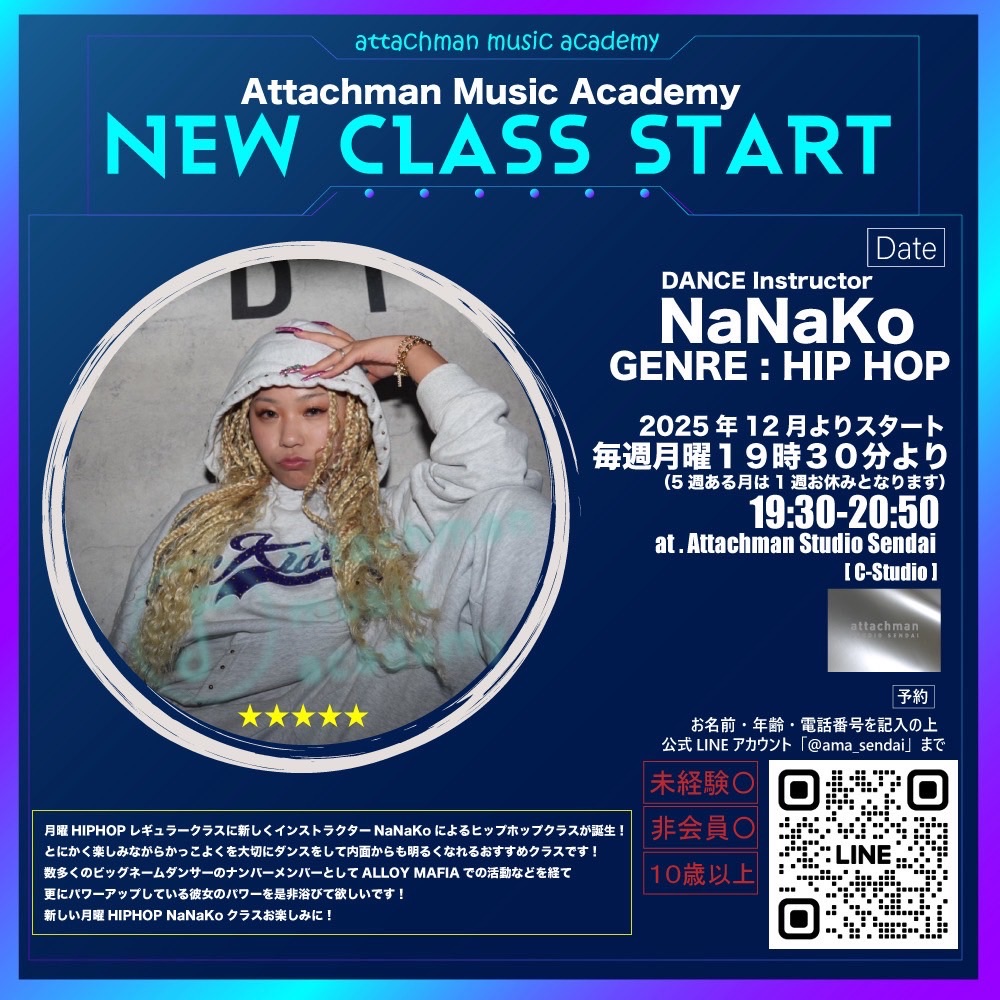 アタッチマン月曜HIPHOPレギュラークラスに新しくインストラクターNaNaKoを迎えて12月よりヒップホップクラスが誕生します!